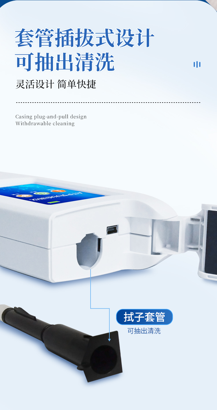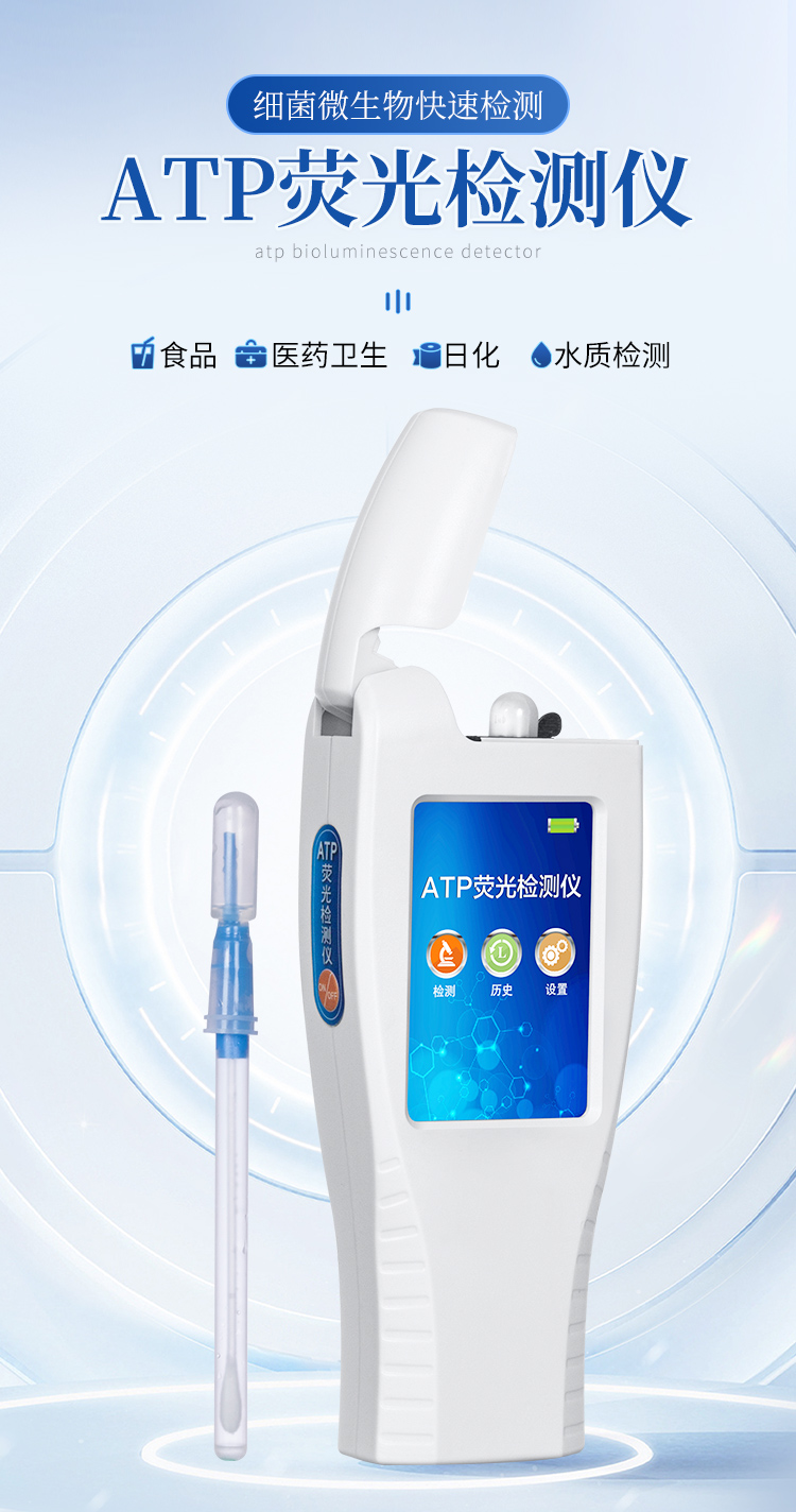 該設(shè)備采用生物化學(xué)反應(yīng)方法檢測ATP含量,細(xì)菌檢測儀基于螢火蟲發(fā)光原理,利用“熒光素酶—熒光素體系”快速檢測三磷酸腺苷(ATP)。ATP拭子含有可以裂解細(xì)胞膜的試劑,能將細(xì)胞內(nèi)ATP釋放出來,與試劑中含有的特異性酶發(fā)生反應(yīng),產(chǎn)生光,再用熒光照度計檢測發(fā)光值,微生物的數(shù)量與發(fā)光值成正比,由于所有生物活細(xì)胞中含有恒量的ATP,所以ATP含量可以清晰地表明樣品中微生物與其他生物殘余的多少,用于判斷衛(wèi)生狀況。