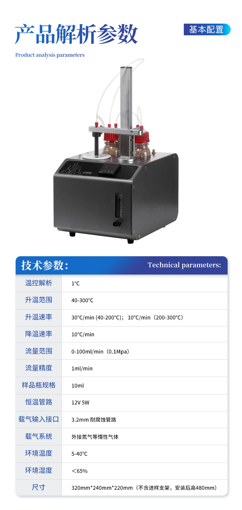 | 型號(hào):YT-KSL | 溫控解析:1℃ | 升溫范圍:40-300℃ | 升溫速率:30℃/min (40-200℃); 10℃/min(200-300℃) | 降溫速率:10℃/min | 流量范圍:0-100ml/min(0.1Mpa) | 流量精度:1ml/min | 樣品瓶規(guī)格:10ml | 恒溫管路:12V 5W | 載氣輸入接口:3.2mm 耐腐蝕管路 | 載氣系統(tǒng):外接氮?dú)獾榷栊詺怏w | 環(huán)境溫度:5-40℃ | 環(huán)境濕度:<65% | 尺寸:320mm*240mm*220mm(不含進(jìn)樣支架,安裝后高480mm) |