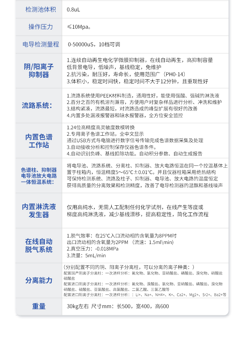 微處理器控制的雙柱塞往復(fù)泵,采用**的智能控制算法,能使泵的流量脈動降至**水平。 1.1,材質(zhì):鑲嵌式PEEK材料無阻尼泵頭,PEEK管路,適合于pH為0~14的淋洗液及反相有機溶劑。 1.2,流量范圍:0.001~9.999ml/min,增量0.001ml/min。 1.3,流量設(shè)定值誤差:≤0.1% 1.4,流量穩(wěn)定性:≤0.1% 1.5,工作壓力:35MPa 1.6,過壓保護(hù):工作壓力超過或低于設(shè)定的上限或下限時,泵將自行關(guān)閉且報警。 | 2 電導(dǎo)檢測器: 2.1,原理:五極電導(dǎo)檢測器 2.2,電極材料:鈍化316L不銹鋼 2.3,基線噪音:≤0.002μS/cm 2.4,基線漂移:≤0.008μS/cm·30min 2.5,zui小檢出濃度:≤0.0005ug/mL(以Cl-計) 2.6,儀器線性:≥0.9995 2.7,定量重復(fù)性:≤0.1%(以Cl-計) 2.8,定性重復(fù)性:≤0.1%(以Cl-計) 2.9,測量范圍:0~50000us/cm 2.10,分辨率:≤0.0020ns/cm 2.11,檢測池體積:0.8uL 2.12,操作壓力:≤10Mpa。 2.13,電導(dǎo)檢測量程: 0-50000uS,10檔可調(diào)。 | 3、 陰、陽離子抑制器: 3.1連續(xù)自動再生電化學(xué)微膜抑制器,在線自動再生,高抑制容量,低背景電導(dǎo),低噪聲,基線穩(wěn)定,免維護(hù)。 3.2抗污染,耐壓好,壽命長,使用范圍廣(PH0-14)。 3.3體積小,穩(wěn)定時間快,穩(wěn)定時間不大于12分鐘,且重現(xiàn)性好。 | 4 流路系統(tǒng): 4.1流路系統(tǒng)使用PEEK材料制造,通用性好,能使用強酸、強堿的淋洗液。 4.2百分之百的有機溶劑兼容,方便用戶對復(fù)雜樣品進(jìn)行分析、沖洗和維護(hù)。 4.3 結(jié)構(gòu)緊湊,流路*短,對流路造成的峰型擴(kuò)展有很好的改善。 4.4 內(nèi)置多處漏液報警器和缺水報警器,全方位安全監(jiān)控。 | 5 內(nèi)置色譜工作站: 5.1 24位高精度高靈敏度數(shù)模轉(zhuǎn)換。 5.2專用離子色譜工作站,全中文顯示,通過USB方式與電腦進(jìn)行數(shù)字信號傳輸,完成色譜數(shù)據(jù)采集及處理。 5.3自動接收分析和控制保存儀器色譜條件。 5.4自動識別負(fù)峰、基線扣除功能。自動積分參數(shù)、自動生成報告。 | 6 色譜柱、抑制器、電導(dǎo)池、放大電路一體恒溫系統(tǒng): 將電導(dǎo)池、流路系統(tǒng)、分離柱、抑制器、放大電路恒溫在同一個控溫基體上置于柱箱內(nèi),恒溫精度5~65℃±0.01℃。并且儀器柱箱采用絕熱結(jié)構(gòu),可保持檢測系統(tǒng)、流路及柱子、抑制器、電導(dǎo)池、放大電路的溫度恒定,獲得高質(zhì)量的分離效果和檢測精度,改善了電導(dǎo)檢測器的溫飄和基線噪聲。 | 7內(nèi)置淋洗液發(fā)生器,僅用高純水,無需人工配制任何化學(xué)試劑,在線產(chǎn)生等度或梯度高純淋洗液,減少基線漂移,提高穩(wěn)定性,簡化工作流程。 | 8 在線自動脫氣系統(tǒng): 1,脫氣效率:在25℃入口流動相的含氧量為8PPM時,出口流動相的含氧量為2PPM (流速:1.5ml\min) 2,真空壓力:-0.018MPa 3,流量:5mL/min | 9 分離能力:(分別配置不同的陰、陽離子分離柱,可以分離的離子種類:) 配置國產(chǎn)陰離子分離柱:一次進(jìn)樣分析:氟化物、氯化物、亞硝酸鹽、磷酸鹽、溴化物、硝酸鹽、硫酸鹽 配置進(jìn)口陰離子分離柱:一次進(jìn)樣分析:氟化物、溴酸鹽、氯化物、亞硝酸鹽、磷酸鹽、溴化物、硝酸鹽、硫酸鹽、亞氯酸鹽、高氯酸鹽、二氯乙酸、三氯乙酸等 配置進(jìn)口陽離子分離柱:一次進(jìn)樣分析::Li+、Na+、NH4+、K+、Ca2+、Mg2+、Sr2+、Ba2+等 | 10 重量:30kg左右 尺寸mm:長500,寬400,高600 |