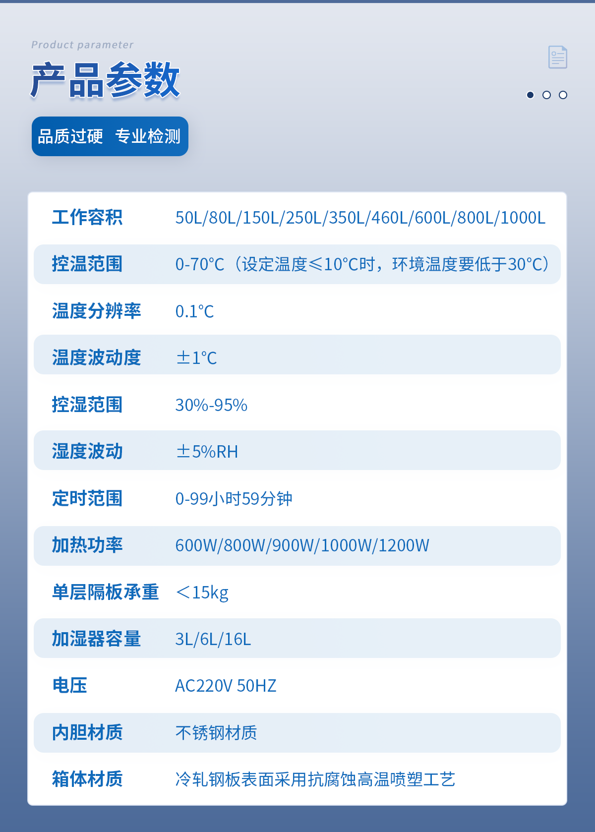 | 工作容積:50L | 箱內(nèi)照明:日光燈 | 控溫范圍:0-70℃(設(shè)定溫度≤10℃時環(huán)境溫度要低于30℃) | 程序控制:24段 | 溫度分辨率:0.1℃ | 溫度波動度:±0.5℃ | 控濕范圍:30%-95% | 定時范圍:0-99小時59分鐘 | 加熱功率:600W | 內(nèi)箱尺寸 寬*深*高(cm):40*30*40 | 外箱尺寸 寬*深*高(cm):55*50*97 | 隔板層數(shù)(標配):2層 | 層間隔/mm:19 | 卡槽層數(shù):8 | 加濕器容量(標配):3L | 單層隔板承重:<8kg | 底部總承重:20kg | 電壓:AC220V 50HZ | 整機重量:46kg | 內(nèi)膽材質(zhì):不銹鋼材質(zhì) | 箱體材質(zhì):冷軋鋼板表面采用抗腐蝕高溫噴塑工藝 |