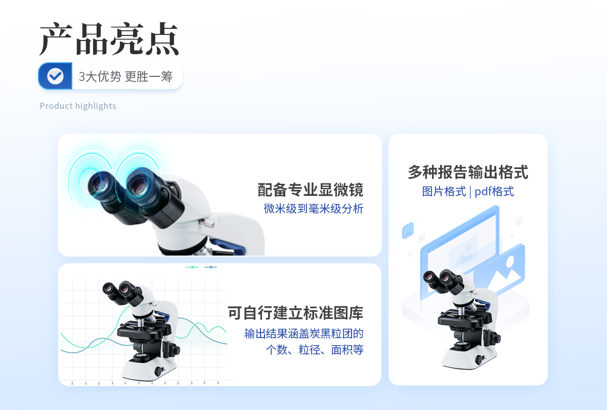 | 1. 采用專業(yè)圖像分析法由計(jì)算機(jī)完成炭黑分散度等級(jí)的判定,檢測(cè)精度高; | 2. 對(duì)目標(biāo)炭黑粒徑可從微米級(jí)到毫米級(jí)進(jìn)行分析; | 3. 配備專業(yè)顯微鏡,配以500萬CMOS圖像傳輸器; | 4. 可單張保存圖像,圖像大小由640*480,1024*768,1280*1024,2592*1944四種大小可供選擇; | 5. 豐富的圖像處理功能,滿足多種圖像處理需要; | 6. 軟件具有自動(dòng)和手動(dòng)兩種方式進(jìn)行炭黑圖像分割; | 7. 軟件可滿足對(duì)局部分析的要求; | 8. 配備測(cè)微標(biāo)尺,可進(jìn)行像素點(diǎn)尺寸校準(zhǔn),并且軟件具有移動(dòng)標(biāo)尺功能,可進(jìn)行任意兩點(diǎn)距離測(cè)量; | 9. 根據(jù)橡膠中炭黑種類,建立了由ISO提供的標(biāo)準(zhǔn)圖庫,以滿足客戶的目測(cè)對(duì)比需求; | 10. 客戶可以自行建立標(biāo)準(zhǔn)圖庫; | 11. 輸出結(jié)果涵蓋炭黑粒團(tuán)的個(gè)數(shù)、粒徑、面積等,并可以數(shù)據(jù)報(bào)表和excel的形式進(jìn)行輸出; | 12. 提供圖像灰階分布圖、粒子徑分布圖、粒度分布圖; | 13. 報(bào)告結(jié)果包括:樣品名、標(biāo)準(zhǔn)名、原始圖像、灰階圖等。報(bào)告輸出格式多樣,可以選擇圖片格式或pdf格式進(jìn)行保存; | 14. 軟件試用各種主流操作系統(tǒng),與win7/win10/winXP等有很好兼容性; | 15. 采用usb2.0數(shù)據(jù)接口,可適配多種采集設(shè)備(如:攝像頭或數(shù)碼相機(jī))。 |